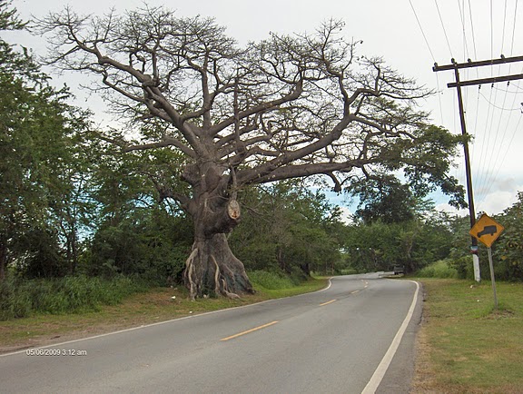 La fotografía que sigue muestra una de las contadas ceibas que hay en el territorio de Salinas. Estos árboles se cuentan entre los de más larga vida en América. Además de este ejemplar en Los Poleos, hay una en la barriada Las Marías y otra en la entrada del Campamento Santiago. Las tres son ceibas centenarias y estaban ahí antes de que se trazara la carretera número 1. Lamentablemente a la ceiba de Los Poleos, la intrusa carretera le costó perder un brazo.