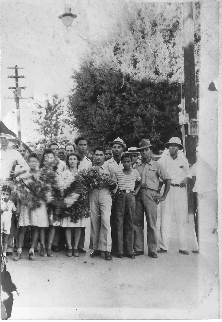 Estas dos fotos llegaron a las manos de Roberto Quiñones con el debido permiso para ser publicadas. La primera de ellas, tomada frente a la Plaza Delicias, fue el entierro de una niña de cuatro años llamada Irene, hija de Don Vicente Torres y Doña Julia Ramos residentes del Coco. La segunda foto data de 1943 y capta un instante del entierro de Concepción Torres, la mamá de Fonsito Cruz. En ellas se recogen los rostros de algunas personas que los lectores de la edad dorada pueden identificar. La señora Torres murió casualmente a causa de complicaciones durante el parto.