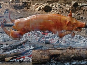 Sepa usted que asar un lechón a la vara es una tarea seria y tediosa. Te tardas una hora en encender el carbón, luego debes controlar el fuego, meticulosamente virar el puerco para que se tueste bien y de vez en cuando rociarlo con el jugo que suelta. No puede excederse uno con las cervezas, no vaya a ser que se pasme el lechón y se arruine el trabajo. Es una vigilia de 4 a 5 horas. Los amigos y familiares confraternizan lejos del humo que te hace llorar. Cuando te toca voltear la vara quedas en una cósmica soledad que nadie envidia y te pone a reflexionar.