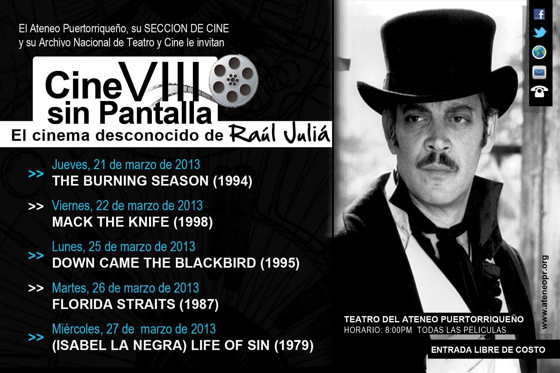 La Serie Cine Sin Pantalla VIII exhibirá cinco de las actuaciones menos conocidas de Raúl Juliá. La Serie comenzará a partir del próximo jueves, 21 de marzo de 2013, a las 8:00 pm con la exhibición de la película THE BURNING SEASON, en la que Juliá encarna el personaje de Chico Mendes y su lucha por proteger la selva amazónica.