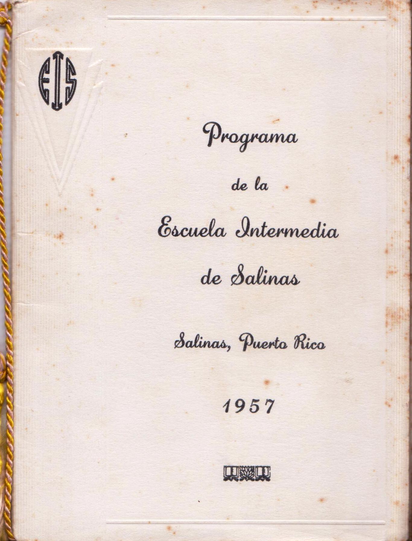 Ese es el caso del documento que presentamos a los lectores de Encuentro Al Sur. Se trata de un modesto programa de graduación. Un anuario al estilo de los que se hacían cincuenta años atrás. Este documento registra los nombres de 120 estudiantes que en 1957 se graduaron de la Escuela Intermedia Urbana Salinas. Personas que se ubican existencialmente como alumnos de una escuela en un pueblo de la Isla en un momento dado. Nombres que tal vez pueden ser ubicados aquí, en cualquier otro lugar del mundo, o simplemente personas cuya existencia cesó.