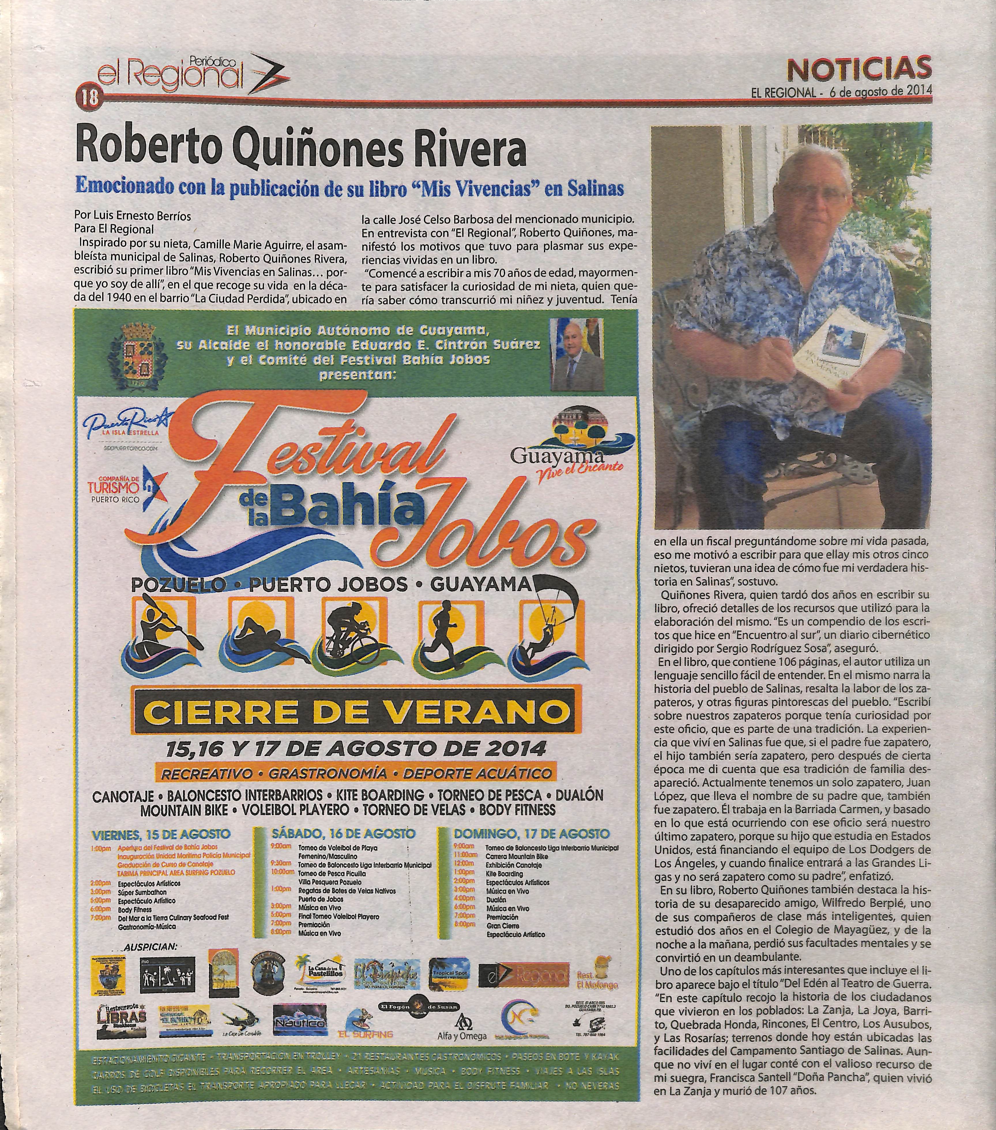 El periodico El Regional reseño en su edición del del 6 de agosto de 2014 el libro Mis vivencias en Salinas: porque yo soy de allí del autor y actual vicepresidente de la Legislatura Municipal de Salinas Roberto Quiñones Rivera. Reproducios aquí la página 18 del periódico.
