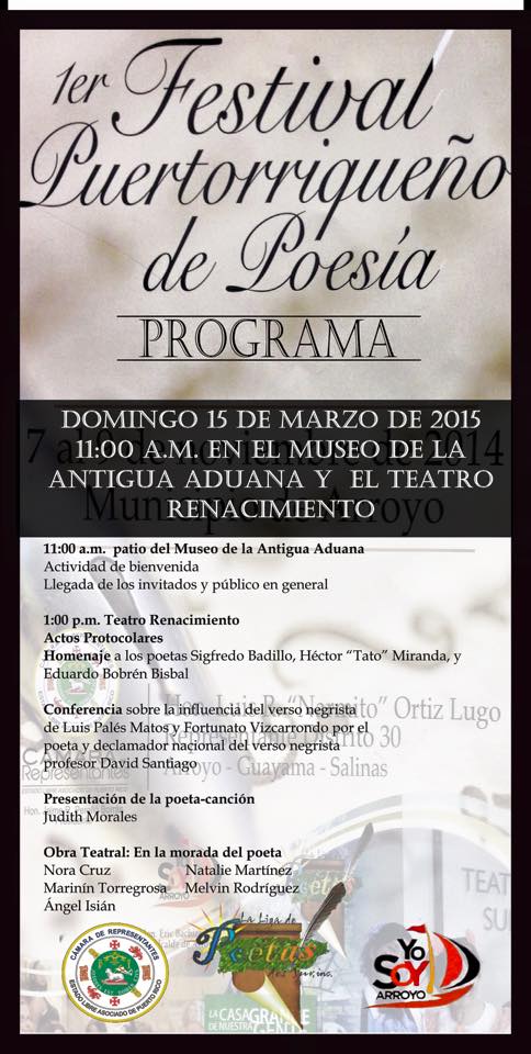 La Liga de Poetas del Sur invita al 1er Festival Puertorriqueño de Poesía que se celebrará este domingo 15 de marzo en Arroyo. El evento literario se celebrará en el Teatro Renacimiento y en el Museo de la Aduana incluyendo conferencias sobre poesía negra y presentaciones artísticas y poéticas.