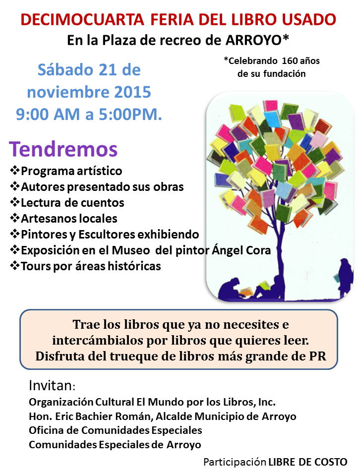 ¿Te apasiona la lectura? ¿Tienes libros que ya no te interesa retener? ¿Quieres intercambiarlos? ¡Ven a la Decimocuarta Feria del Libro Usado! El más grande intercambio de libros usados de Puerto Rico al cual el Municipio de Arroyo le abre sus puertas para recibirnos en la Plaza de Recreo, el sábado 21 de noviembre, a partir de las 9:00 am