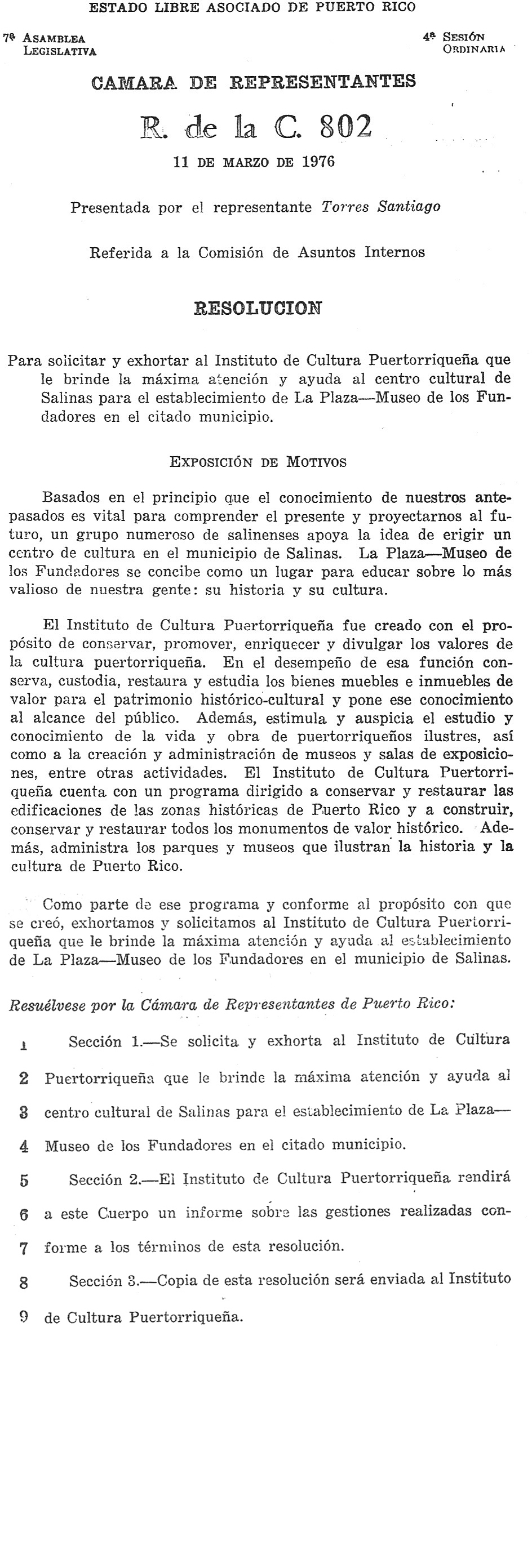 11 de marzo de 1976, en la cuarta sesión de la Asamblea Legislativa de Puerto Rico, se aprueba la Resolución de la Cámara de Representantes 802, solicitándole al Instituto de Cultura Puertorriqueña que brinde la máxima atención y ayuda al Centro Cultural de Salinas para el establecimiento de la Plaza-Museo de Fundadores. (Ver documento)